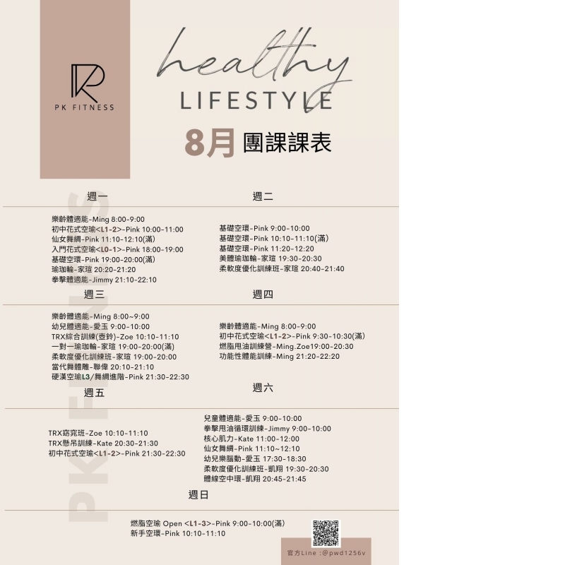 團體課程8月新課表 -開放報名 -當天課程兩人預約即可開課 專屬App挑選喜歡的課程 -上課通知訊息 貼心好方便 團課點數可與親朋