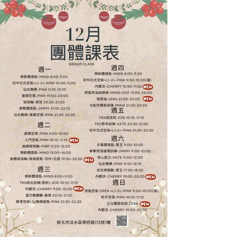 團體課程12月新課表 -開放報名 -當天課程兩人預約即可開課 專屬App挑選喜歡的課程 -上課通知訊息 貼心好方便 團課點數可與親